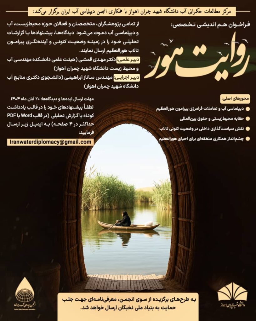 ✅️ به همت انجمن دیپلماسی آب ایران و مرکز مطالعات حکمرانی آب دانشگاه شهیدچمران اهواز برگزار می شود. ⭕️ *فراخوان هم اندیشی تخصصی روایت هور* 🔶️ *دبیر علمی: دکتر مهدی قمشی،* عضو هیات علمی دانشکده مهندسی آب و محیط زیست دانشگاه شهید چمران اهواز 🔶️ *دبیر اجرایی: مهندس ساناز ابراهیمی،* دانشجوی دکتری منابع آب دانشگاه […]